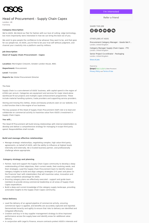 Head Of Procurement Supply Chain Capex Job At Asos In London United Kingdom 57111274 Tapwage Job Search